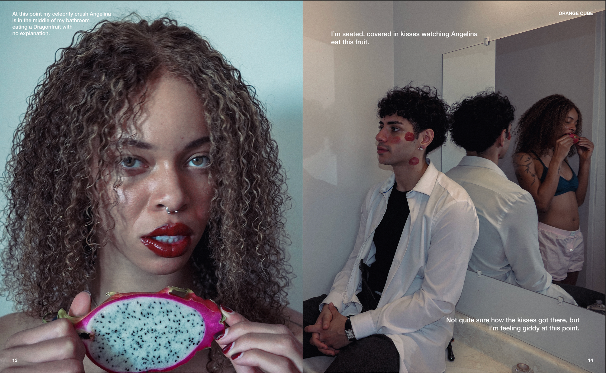 Set in bathrooms and domestic spaces, the images explore desire, beauty, celebrity, and performance. Strawberry offerings, razors, and lipstick marks punctuate bodies and spaces. Text threads through with wit and vulnerability, turning attraction and grooming into ritual and spectacle.